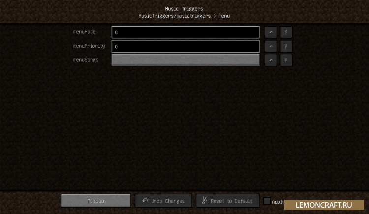 Для проигрывания музыки вам нужно положить свой музыкальный файл в формате ogg в папку config/MusicTriggers/songs/assets/musictriggers/sounds/music. После этого заходите в меню мода и указываете путь к нужному файлу для нужного триггера.